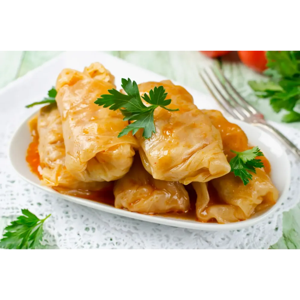 - Состав: Капуста белокочанная, лук репчатый, морковь, фарш (говядина + свинина), масло растительное, специи.